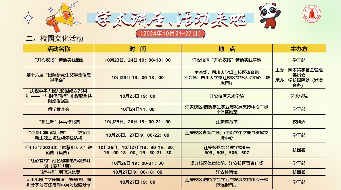 亚洲情色 2024年10月21日-27日学术讲座论坛及校园文化活动预告