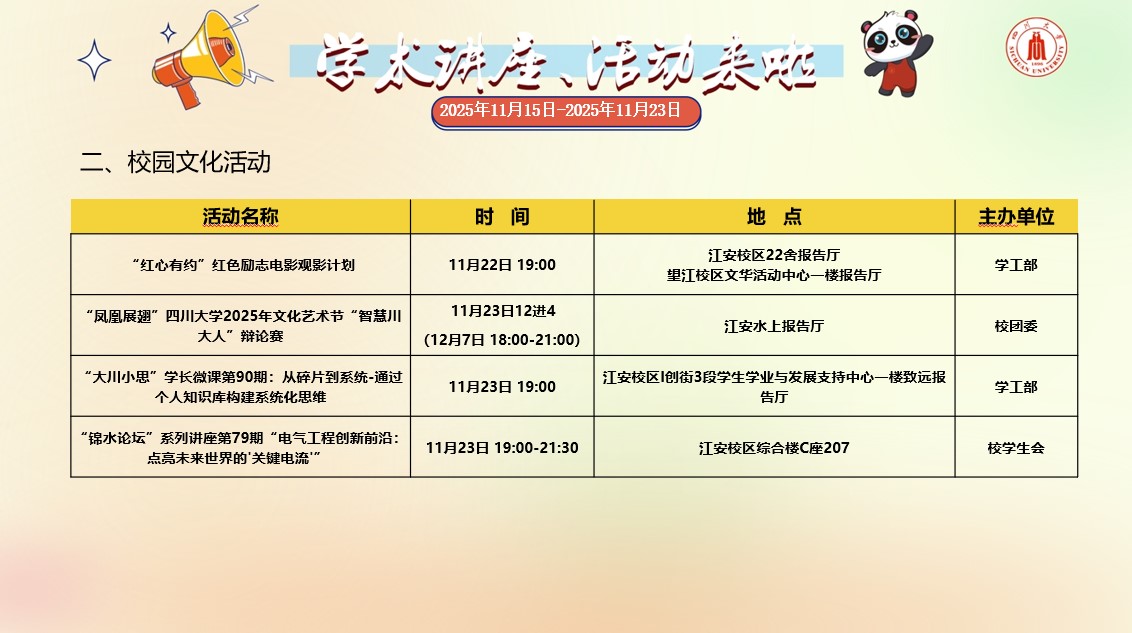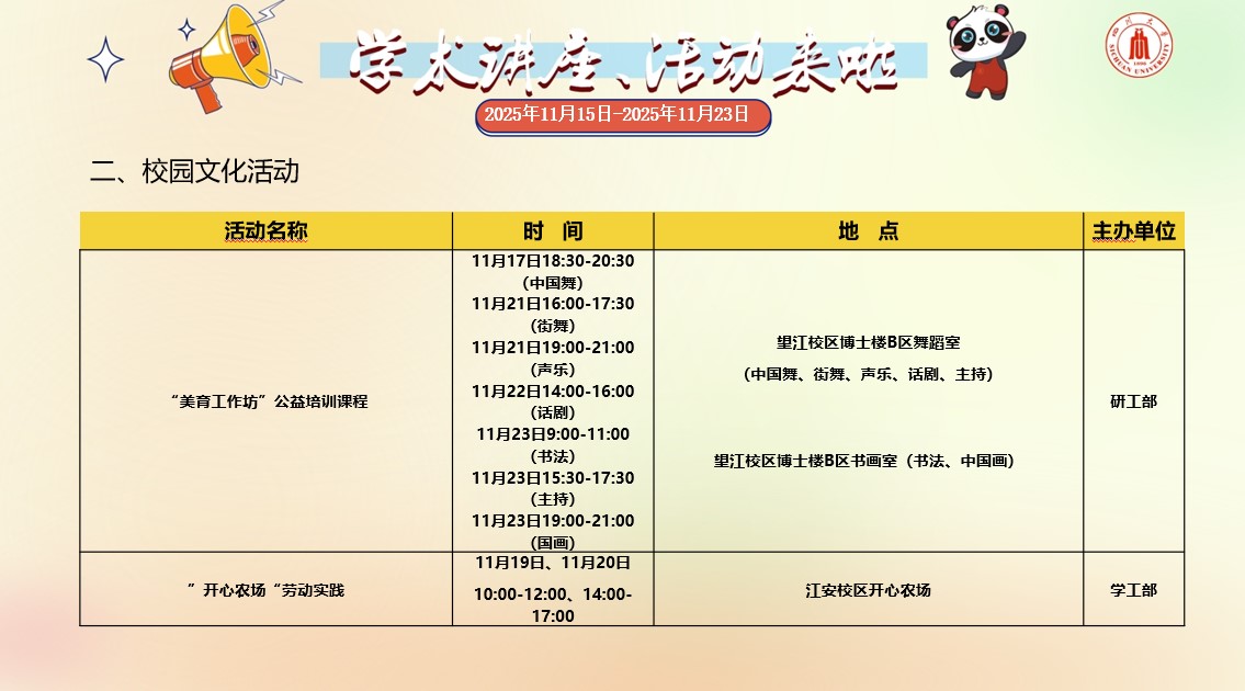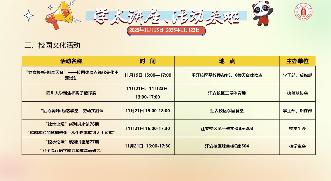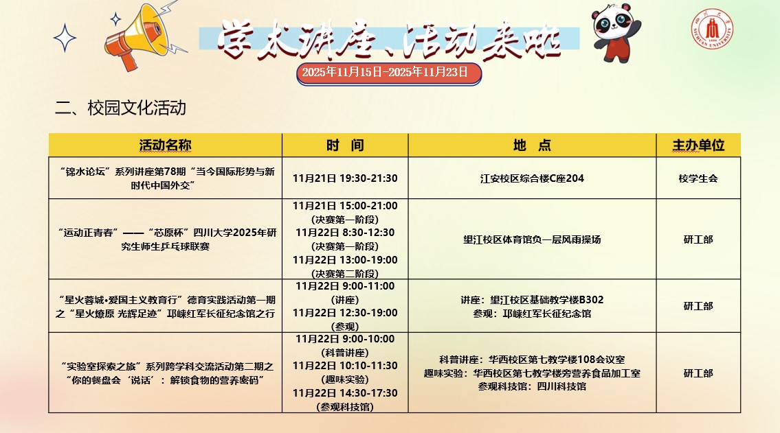 亚洲情色 2025年11月15日-2025年11月23日学术讲座和校园文化活动预告