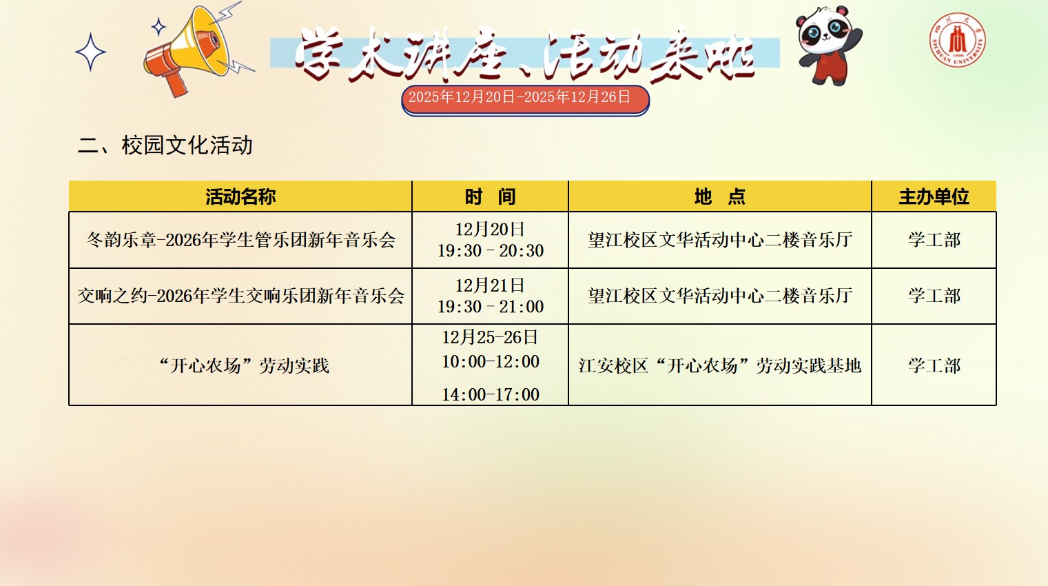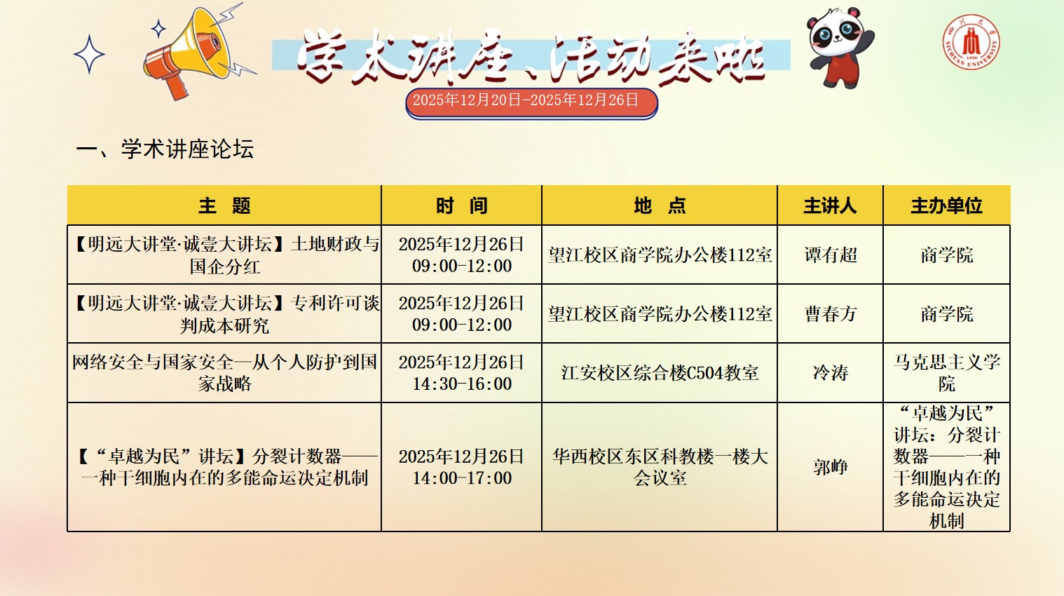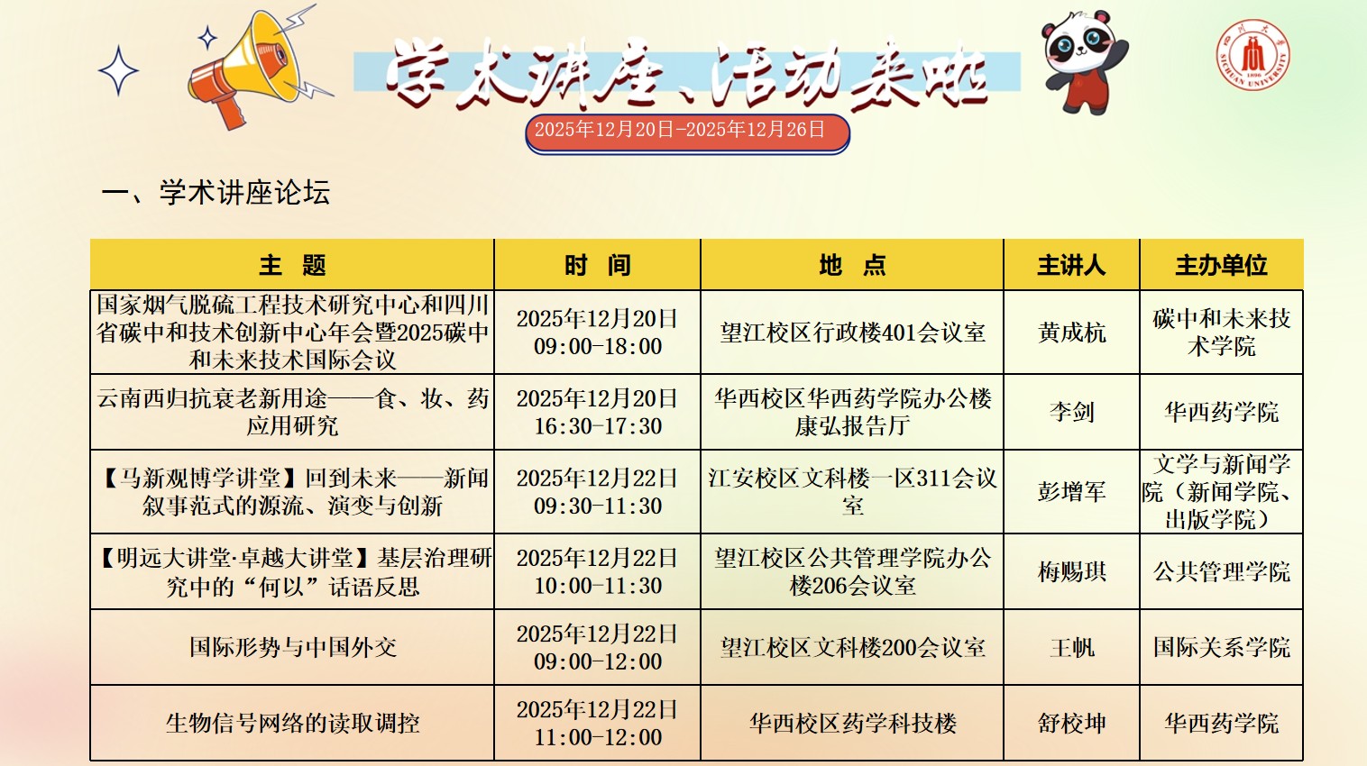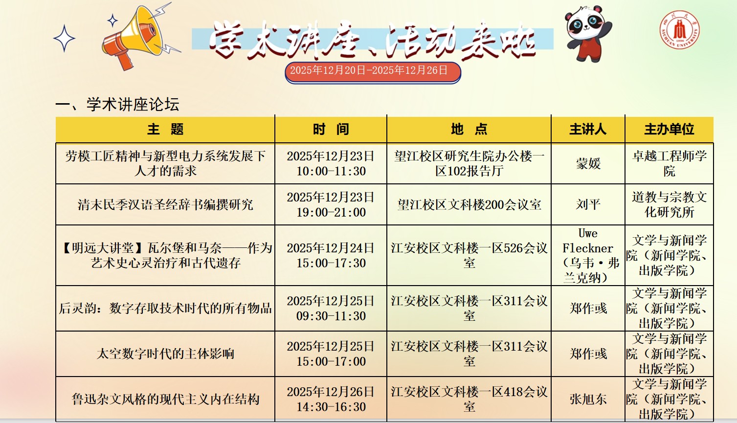 亚洲情色 2025年12月20日-12月26日学术讲座和校园文化活动预告