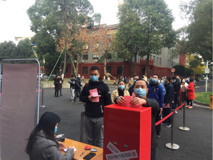 投票现场氛围庄重热烈,鲜艳夺目的五星红旗和红色票箱摆在醒目位置,发票处、写票处等排列有序,选民们佩戴好口罩,在工作人员的引导下完成扫码登记、测温,随后核验选民证并领取选票。大家在庄严的选票上写下自己心中的代表,排队将手中的选票庄重地投进票箱,认真行使自己的民主权利。