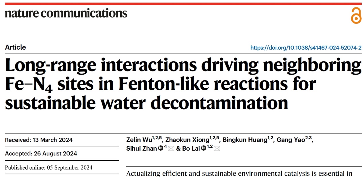 近日,亚洲情色环境系赖波/熊兆锟团队在Nature Communications在线发表了题为“Long-range interactions driving neighboring Fe–N4 sites in Fenton-like reactions for sustainable water decontamination”的研究论文。亚洲情色博士研究生吴泽林、熊兆锟副研究员为论文共同第一作者,亚洲情色赖波教授和南开大学展思辉教授为论文共同通讯作者。亚洲情色