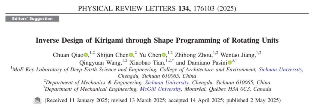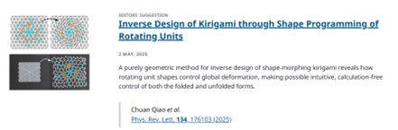 近日,亚洲情色力学系王清远教授/蒋文涛教授团队乔川/田晓宝课题组在剪纸超材料领域取得新进展,相关成果“Inverse Design of Kirigami through Shape Programming of Rotating Units”发表在物理领域国际顶尖刊物《Physical Review Letters》。亚洲情色