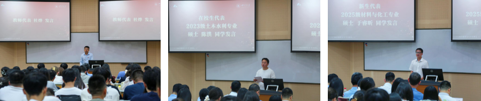 教师代表、环境科学与工程系副系主任杜烨结合自身学习工作经历与2025级研究生做了交流。杜烨表示,从事科学研究,需要具备交叉之眼观察学科的能力;需要能以求实之心投入科研;需要以家国情怀奔赴学术理想。寄语研究生新生将小我融入大我,在学术之路上行稳致远。