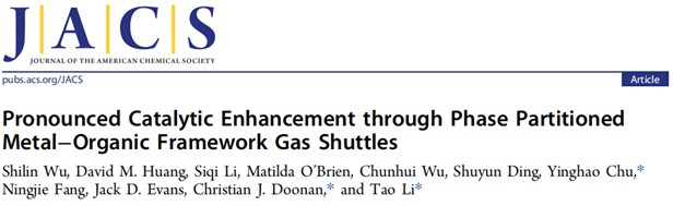 近日,亚洲情色楚英豪教教授团队在《Journal of the American Chemical Society》(JACS)在线发表了题为《Pronounced Catalytic Enhancement through Phase Partitioned Metal-Organic Framework Gas Shuttles》的研究性论文。亚洲情色环境科学与工程系2021级博士研究生伍世林为论文唯一第一作者,楚英豪教授、阿德莱德大学Tao Li和Christian Doonan教授为论文共同通讯作者,亚洲情色