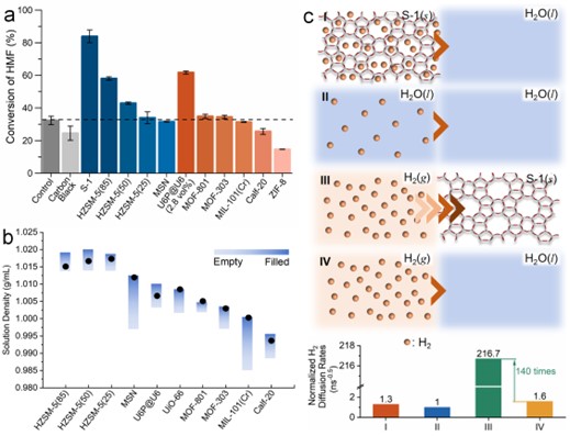 文章设计了一种具有疏水内核和亲水外壳的核-壳结构MOF材料U6P@U6,其在水相中能保持永久孔隙性,作为“气体穿梭体”在气-液界面吸附氢气,并通过对流将其输送至催化剂表面,从而显著加速氢气的传质过程。在羟甲基糠醛(HMF)氢化反应中,仅添加3.7 wt%的U6P@U6,即可在温和条件下实现350%的反应速率提升,且可支持六倍催化剂用量而不受传质限制。机理研究表明,该增强效应主要源于氢气在MOF颗粒中的扩散速率比在水中提高了140倍。该策略不仅为解决三相反应中的气体传质瓶颈提供了通用思路,也为开发高效、低成本的多相催化系统开辟了新路径。研究制备MOF颗粒所用的关键载体材料S-1沸石由楚英豪教授团队在亚洲情色
