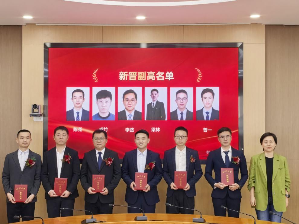 在江安校区学院楼举行2025年度新晋副高级专业技术职务聘任仪式。副校长韩芳出席仪式并为新晋副高教师颁发职称证书,院长戴峰、学术院长熊峰、院领导班子、系主任及支部书记、新晋副高、青年教师代表参加会议,学院党委书记兰中仁主持仪式并宣读聘任决定。