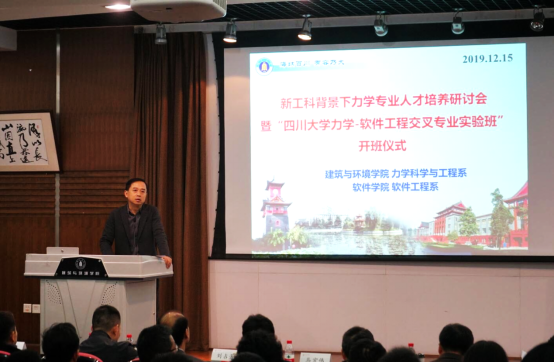 力学-软件工程交叉专业实验班”开班仪式暨新工科背景下力学专业人才培养研讨会在江安校区建环学院二楼报告厅如期举行,王清远、王建祥、马宏伟、李振环、康国政、刘占芳、雷勇军、吴恒安、黄克服,共10位教育部高等学校力学类专业教学指导委员会(以下简称力学教指委)委员、3名企业代表出席了研讨会。学校教务处、软件学院、建环学院领导及力学系师生共200余人参加了会议。
