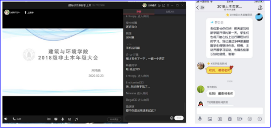 除了召开线上年级大会外,各位辅导员还召开了线上班委会,号召班委同学要在防疫斗争与线上学习中起到模范带头作用。各辅导员还专门召开了湖北籍学生线上关怀会,老师对同学的关心冲破了距离的阻隔,给予他们以强大有力的支持鼓励。除了召开形式多样的学生会议外,各辅导员还特别召开了线上家长会,与学生家长一起协力防疫,监督学习。