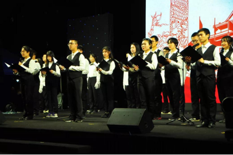 晚会最后,学院领导、老师、嘉宾和全体演职人员齐上台合唱《我和我的祖国》,学院2019级本科生“追梦七十载,同心筑未来”迎新晚会圆满落下帷幕。