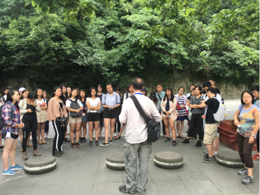 UIP国际课程周第四季“合作交流·智绘乡村”交流营郫都区调研组于7月4日从望江校区及江安校区出发,先于上午10点到达都江堰景区,参观都江堰的水利工程。在参观过程中,艾丹教授向各位介绍都江堰水利工程的历史、概况和作用等。而后参与本次郫都区调研组的师生一同步行至鱼嘴处,合影留恋。