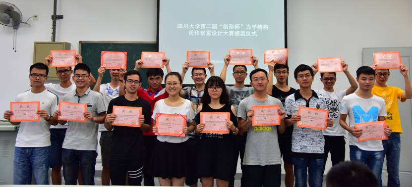 第二届“创形杯”力学结构优化创意大赛于2016年6月30日圆满落幕,学院李晋川教授、黄学进高级工程师、王柏弋老师和部分获奖同学于力学实验室参加了颁奖仪式。