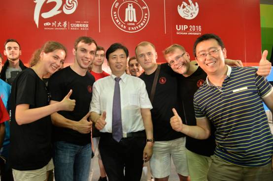 2016年“实践及国际课程周”在江安校区体育馆盛大开幕。来自“中法俄力学交流营”的外国留学生和学生代表参加了开幕式,并与校长谢和平院士合影留念。