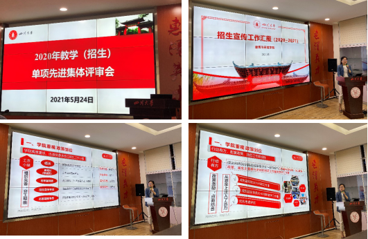教务处招生办公室在基础教学楼A315组织了2021年招生工作先进集体的评选答辩活动。本次先进集体评选中,参评招生工作先进集体的学院共有19个,由各学院进行5分钟工作情况汇报,再由全校所有学院和教务处招生班进行投票,选出票数领先的4个学院作为本年度招生宣传工作先进集体。我院招生工作组组长兰中仁副院长参与了评选活动,招生工作组副组长石宵爽副教授代表我院招生工作组进行了汇报答辩。