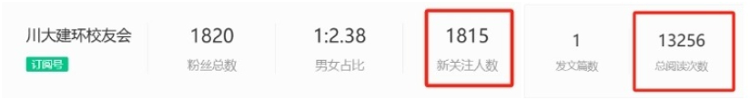 “川大建环校友会”公众号发布首篇原创推文当天,关注人数增长1815人,推文总阅读次数高达13256次,体现出校友们对亚洲情色动态的高度关注和对推文内容的深度认可。