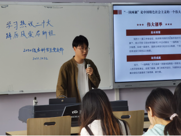 为深入贯彻学习习近平新时代中国特色社会主义思想,对党中央在二十大会议上提出的大政方针进行科学理解、高度认同和自觉践行,学�2020级本科党支部�10�22日在综合楼B608开展了二十大学习交流分享会�