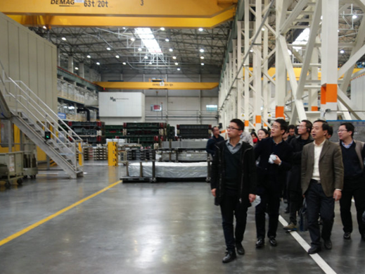 力学系党员教师一行首先抵达一汽大众成都分公司,受到冲压车间的热情接待。在技术专家赵有玲高级工程师的陪同下,首先参观了产品质量控制实验室。实验室拥有大量实验设备,涉及金属板材、非金属配件内饰等的一系列力学性能测定,老师们就材料性能和设备功能与实验室工程师进行了交流探讨。经过安全培训,老师们进入冲压车间参观生产现场。冲压是整车制造流程中的第一道重要工序,在汽车制造业,有“好车从冲压开始”之说,整个冲压过程涉及到诸多力学问题。一汽大众成都分公司冲压车间模修主管陆瑞元向老师们介绍了冲压车间布局和一汽大众先进的冲压工艺。参观过程中,整个冲压车间布置整洁,生产过程井然有序,全自动化生产线尤为壮观。钢板在机械臂的搬运下左右移动,压头和模具上下冲击,循环往复过程中,一批汽车侧门骨架已经成型,全程无需人工操作。
