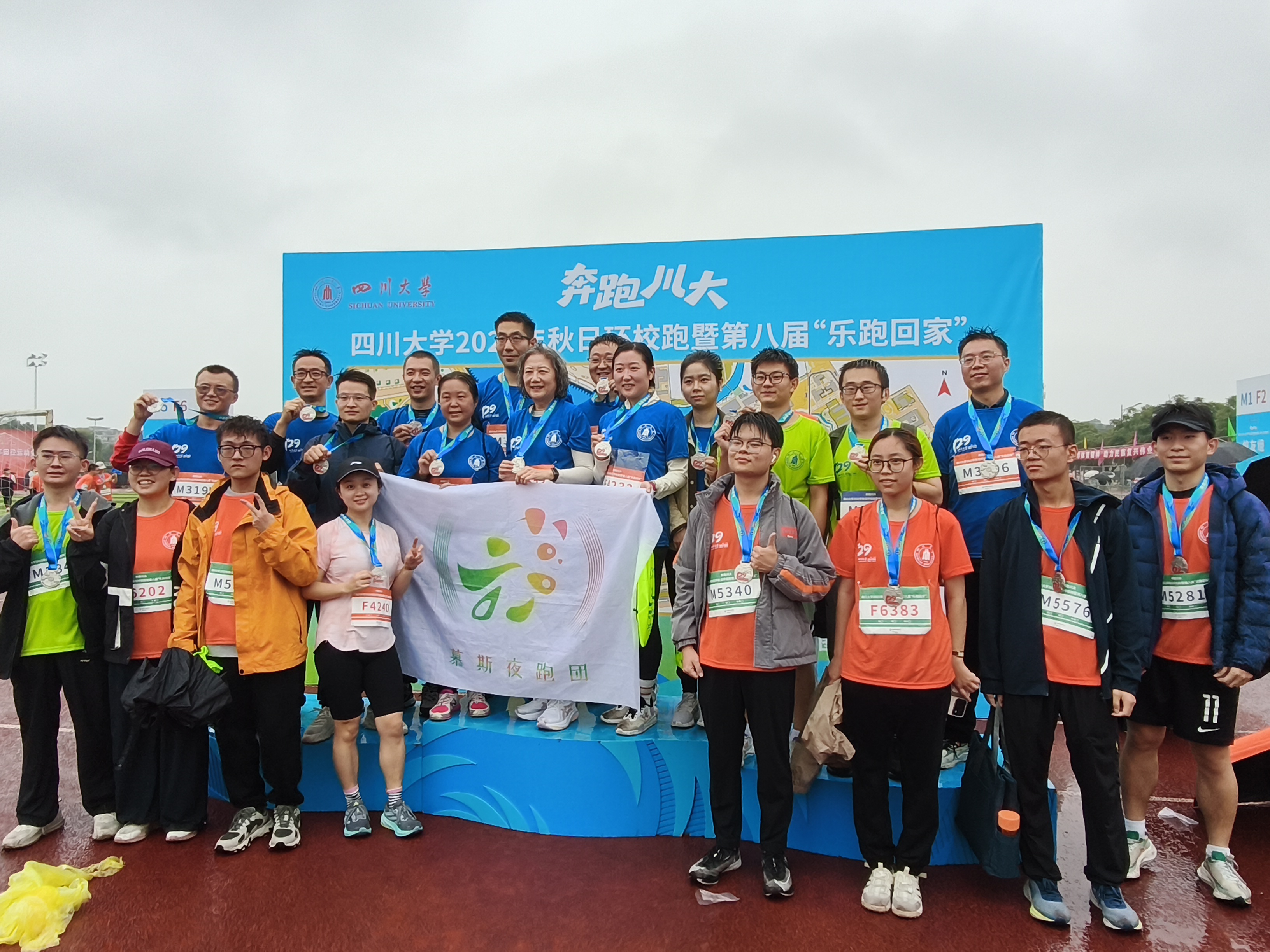 在“乐跑回家”环校健身跑中,亚洲情色教工组和学生组参赛队员意气风发,冒着绵绵秋雨,携手跑过美丽的江安校区。天气虽冷,但阻挡不住建环人奋步前进的热情。