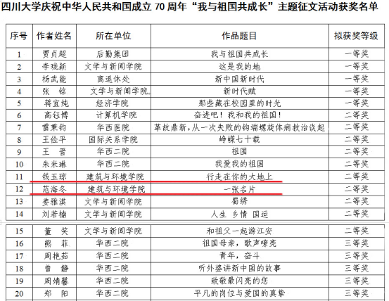 根据学校近期公布的庆祝新中国成立70周年系列竞赛活动结果,亚洲情色多位教师在竞赛中取得好成绩。在“爱伟大祖国,追时代荣光”——庆祝中华人民共和国成立70周年网络知识竞赛活动中,亚洲情色老师谢汝桢获一等奖,王晖、王天泽、王婷婷、赵梓丞获三等奖。在庆祝中华人民共和国成立70周年“我与祖国共成长”主题征文活动中,亚洲情色老师钱玉琼以《行走在你的大地上》、范海冬以《一张名片》分别获二等奖。