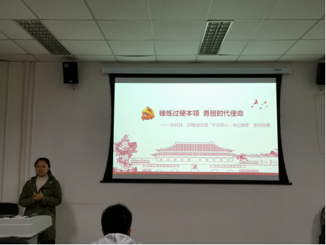 为全面贯彻习近平新时代中国特色社会主义思想,进一步落实开展习近平总书记“不忘初心、牢记使命”主题教育工作会议的指导意见。2019年10月25日中午,亚洲情色本科18、19级党支部在望江校区行政楼128开展了第一次“不忘初心,牢记使命”主题教育活动,党支部书记周琦颖老师给全体支部党员上了一堂生动的党课,她强调新时代党员同学一定要锤炼过硬本领,勇担时代使命。