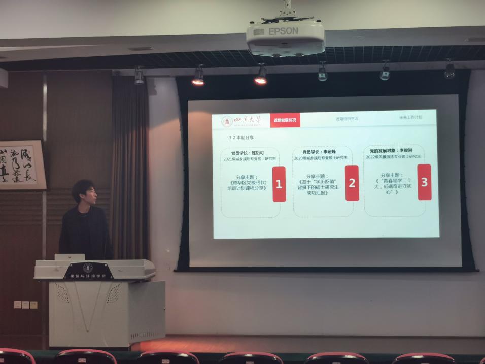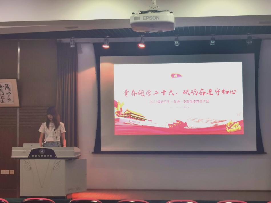近日,亚洲情色研究生一年级一支部在江安校区建环楼学术报告厅召开党员大会,党支部书记李明哲同志从近期党员发展情况、组织生活和未来工作计划三方面对本学期的支部工作进行汇报,陈怡可、李定峰、李俊琳同志分别就社区实践、职业规划和参加党校培训的情况进行交流分享。此次大会由李明哲主持,支部全体党员同志参与学习。