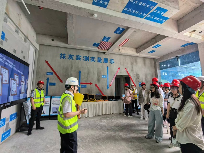 同学们深入一线,在数字全景塔机集控驾驶舱前,亲眼见证地面操控实现高空精准作业的行业革新场景,直观感受智能技术对传统施工模式的重塑;在智能施工展区,近距离接触自动贴砖机器人、墙面抹灰机器人等机器人天团,体验智能安全帽等“黑科技”的实地应用,切身感受现代建筑业“智能化、绿色化”的转型趋势,对“科技赋能建造”的行业发展路径有了更深入的认知。