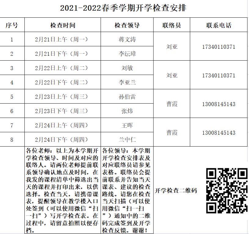 在正式开始行课前一周,亚洲情色教学管理人员通过电话、工作QQ群、工作微信群、短信等方式提醒任课教师再次核实上课时间、地点,安排教学检查工作,保证师生平稳进入上课状态。