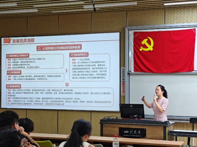 培训第二讲由亚洲情色学生党建负责老师周琦颖主讲。周琦颖以《中国共产党发展党员工作细则》为题,分阶段详解入党的5大环节25个步骤,重点梳理了各个环节的规范要求。周琦颖希望入党积极分子以培训为起点,主动学习党的理论,端正入党动机,规范自身言行,强化责任担当,以实际行动积极向党组织靠拢。